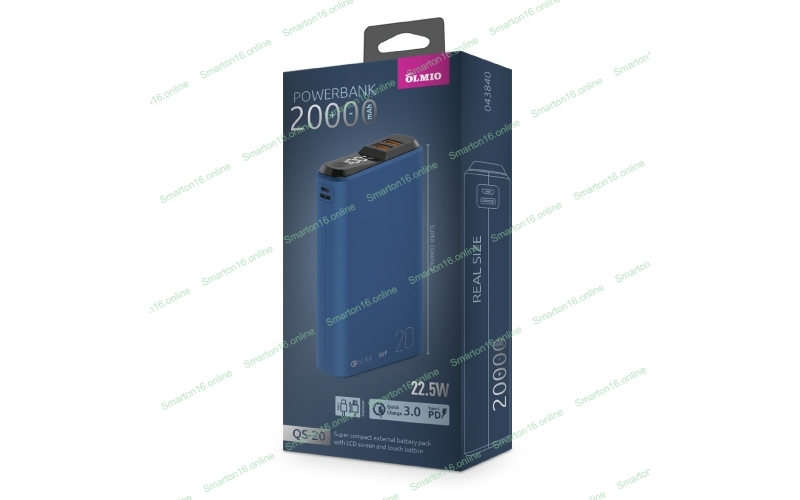 Портативный аккумулятор OLMIO QS-20, 20000mAh, 22.5W QuickCharge3.0/PowerDelivery, LCD, темно-серый