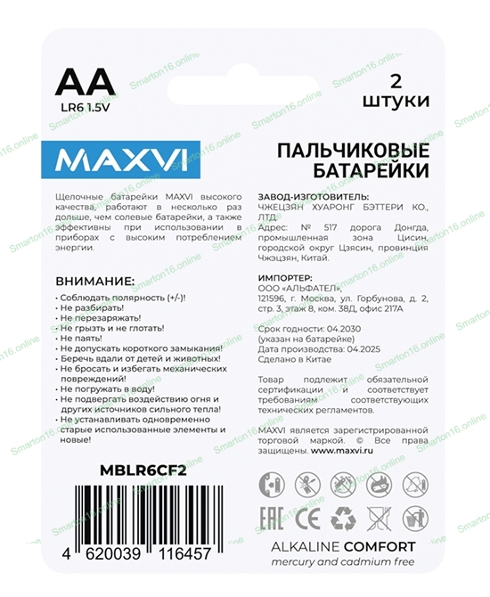 Щелочная батарейка Maxvi MBLR6CF2, COMFORT, AA, alkaline, 2 шт.