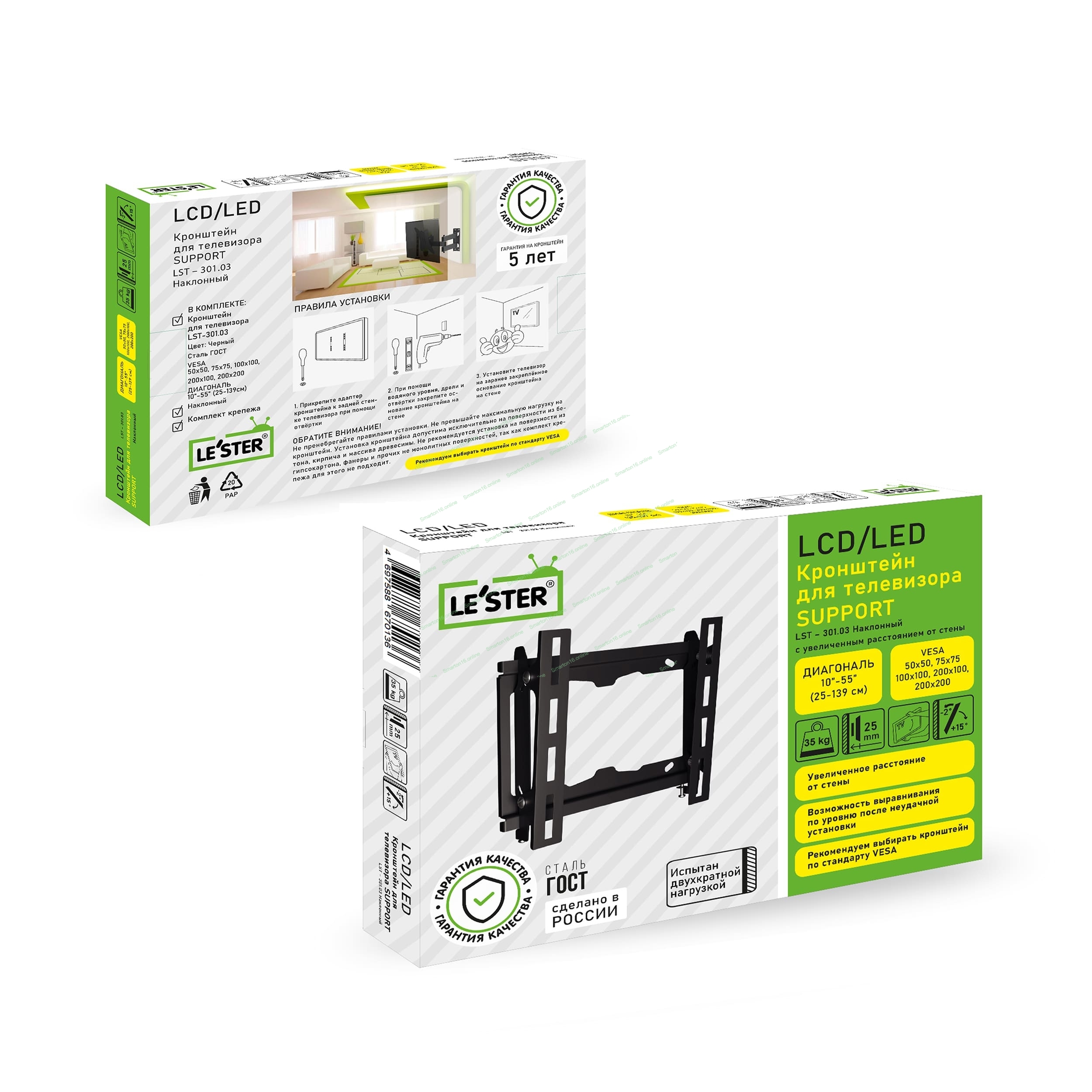 Наклонный с увеличенным расстоянием от стеныДиагональ: 10"-55" (25-139см)Расстояние от стены: 60 ммУгол наклона: -2°/+15°Нагрузка: 35 кгТолщина металла адаптера 1,5 ммРегулировка угла наклона без использования инструмента