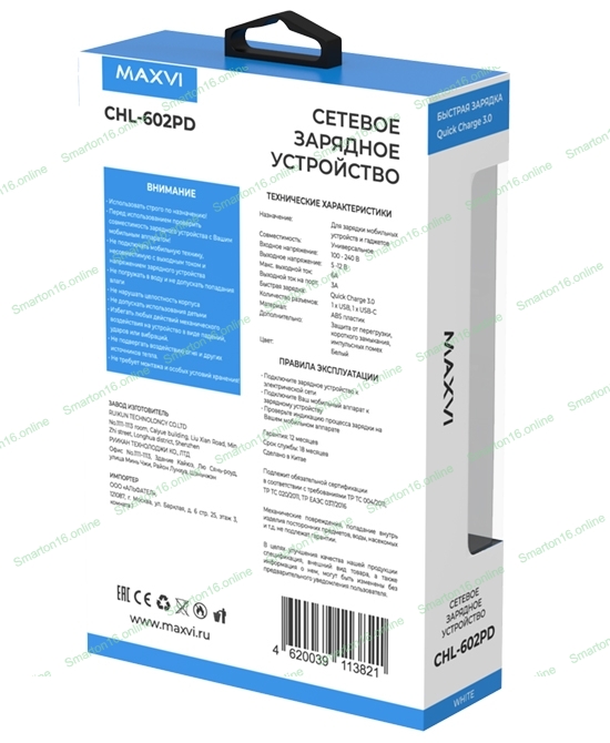 Описание: Универсальный сетевой адаптер с двумя разъемами USB + Type-C, входное напряжение: 100-240В, выходное напряжение: 5В, выходной ток: 6А, Выходная мощность 30Вт. Поддержка быстрой зарядки QC3.0, цвет белый