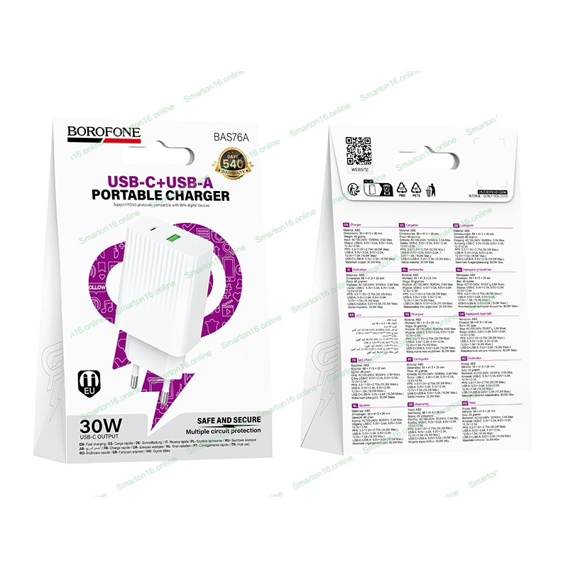 Сетевое зарядное устройство BOROFONE (6941991122880) BAS76A 1USB+1Type-C 3.0A QC3.0 PD 30W White