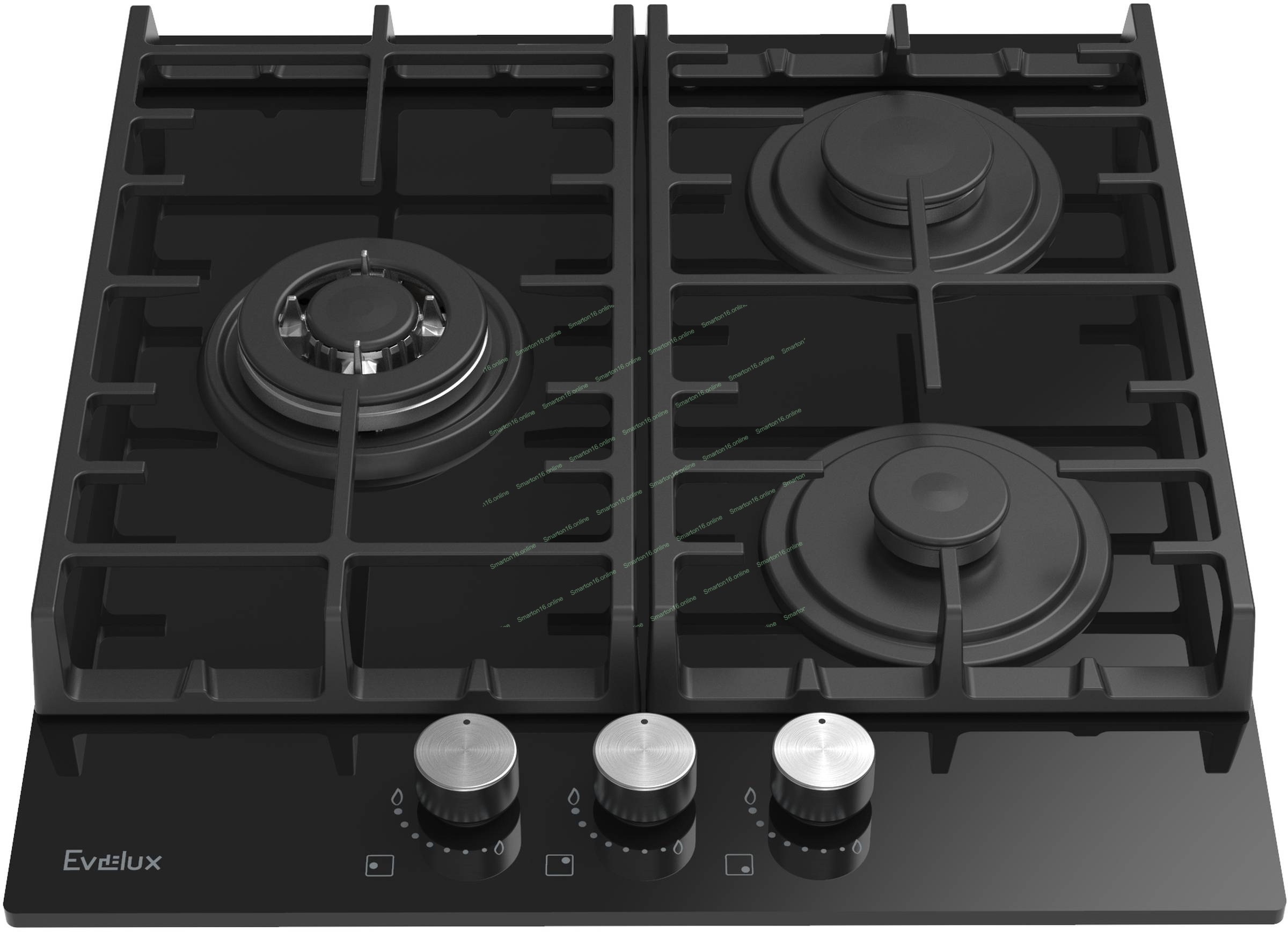45 см, 3 конфорки: экономичная конфорка (0,9 кВт), стандартная конфорка (1,7 кВт), ВОК конфорка (2,5 кВт), газ-контроль, электроподжиг, черное высокопрочное закаленное стекло, чугунные решетки, поворотные переключатели, комплект форсунок-переходников на балонный газ, 460х515х120 мм.