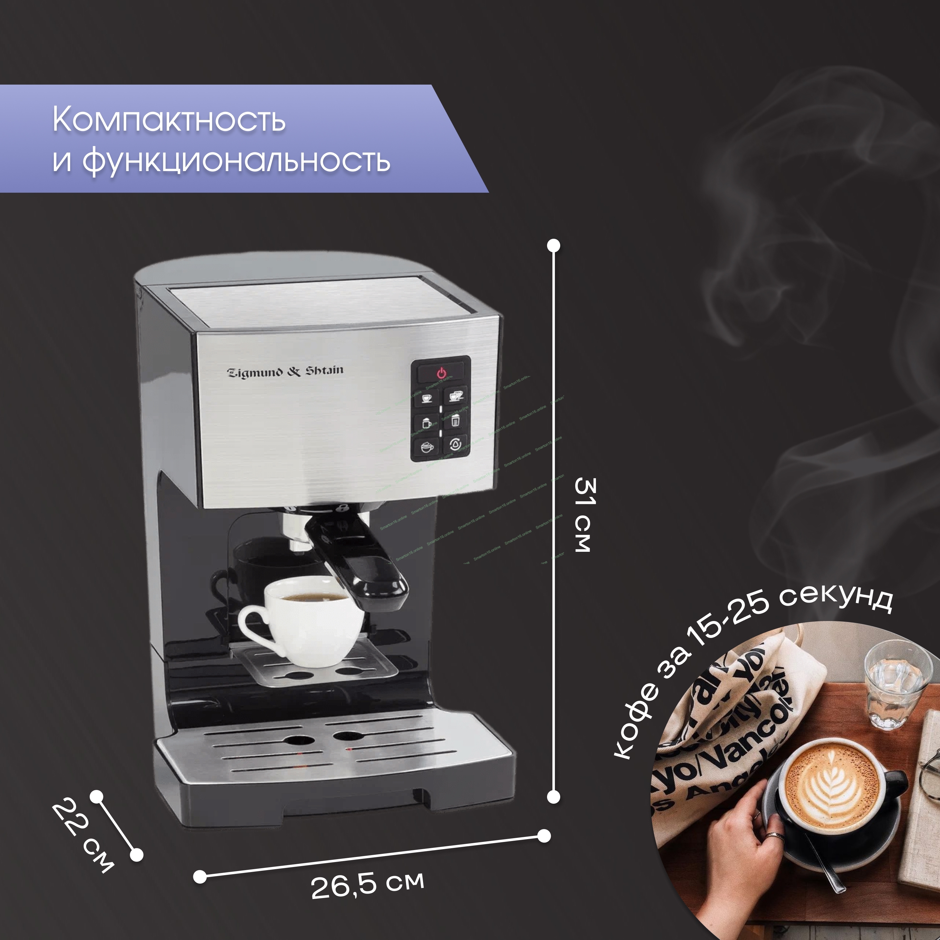 Кофеварка рожковая Zigmund & Shtain ZCM-887 черный/стальной, исп. кофе - молотый, 1.4 л. 1500 Вт, 20 бар