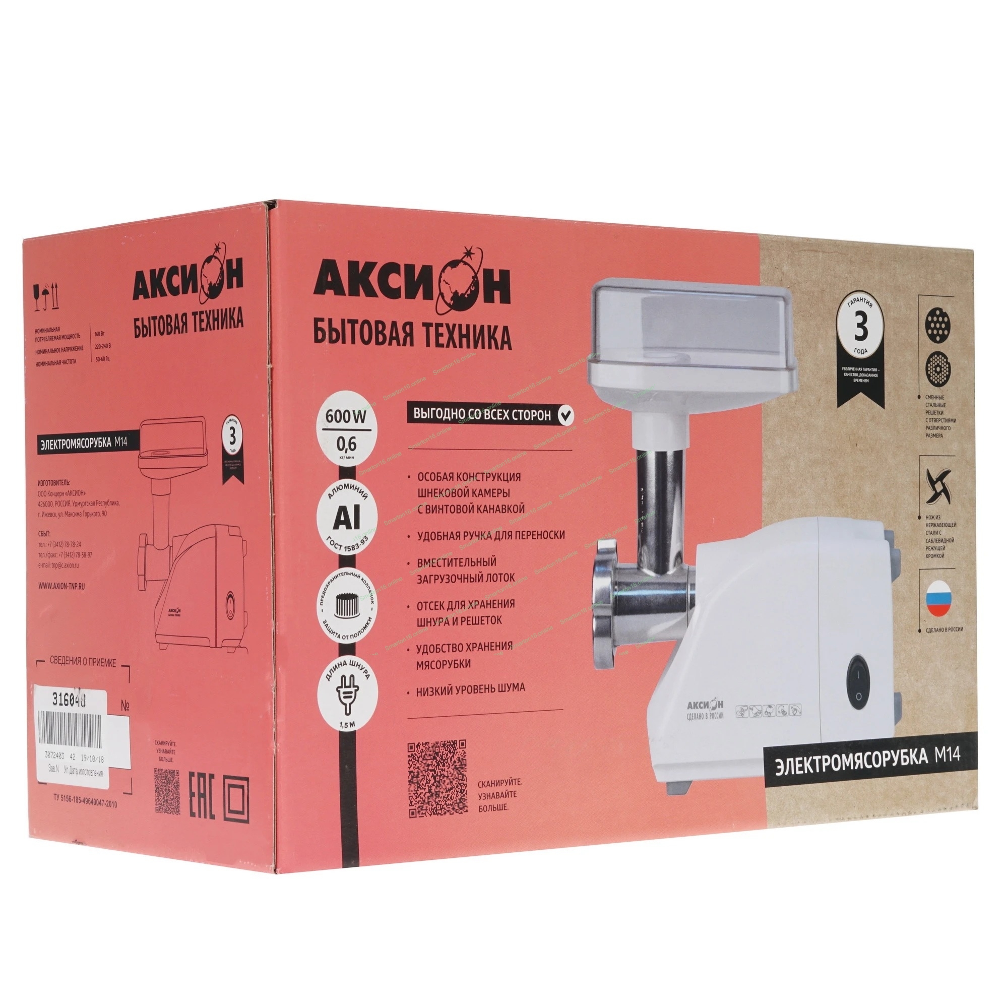 Мясорубка электрическая Аксион М14.02 белый, 600 Вт, 0.7 кг/мин, насадки - 6