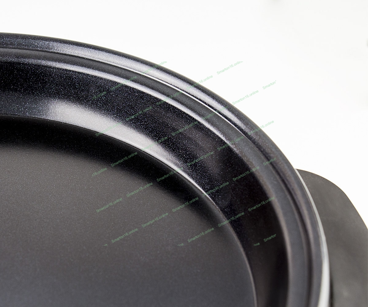 регулятор температуры, индикатор работы, крышка из жаропрочного стекла, жаропрочные ручки, антипригарное покрытие, длина шнура 1 м, книга рецептов, диаметр 32 см, глубина 4 см