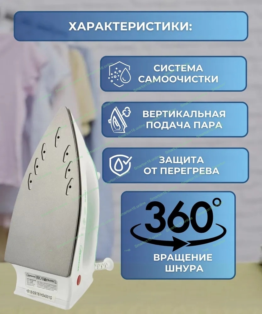 Утюг Homestar HS-4001 белый/зеленый, 2000 Вт, 20 г/мин, 100 г/мин, 90 мл