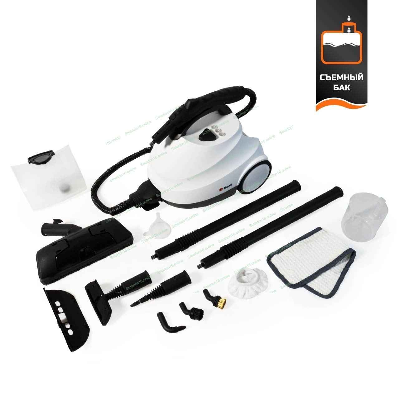 Пароочиститель Bort BDR-2700-R, 2200 Вт; 4 бар; Постоянная подача пара 45 г/мин; Температура пара 143 °С; Емкость бачка 1200 мл; Объем бойлера 1,5 л; Время нагревания 360 с; Время непрерывной работы 35 мин; Длина шланга 2 м; Длина шнура питания 3 м; Размер 400x285x260 мм; Напряжение 220 В; Частота тока 50 Гц; Вес изделия 7,5 кг; Пароочиститель; Конструкция Напольный; Материал Корпуса Пластик; Съемный резервуар для воды;;;; автовыключение; Защита от перегрева; индикация низкого уровня воды;;; Вес брутто=5,5 (Вес нетто=5) кг; 55 x 35 x 36; набор аксессуаров 14 шт; Индикатор нагрева, Электронная система контроля уровня воды, Быстрый нагрев, Блокировка выключателя во включенном состоянии, Набор насадок в комплекте, Возможность долива воды; гарантия 2 г 93412987