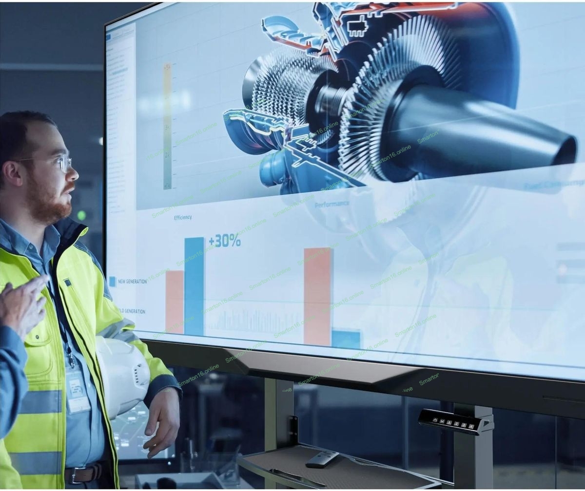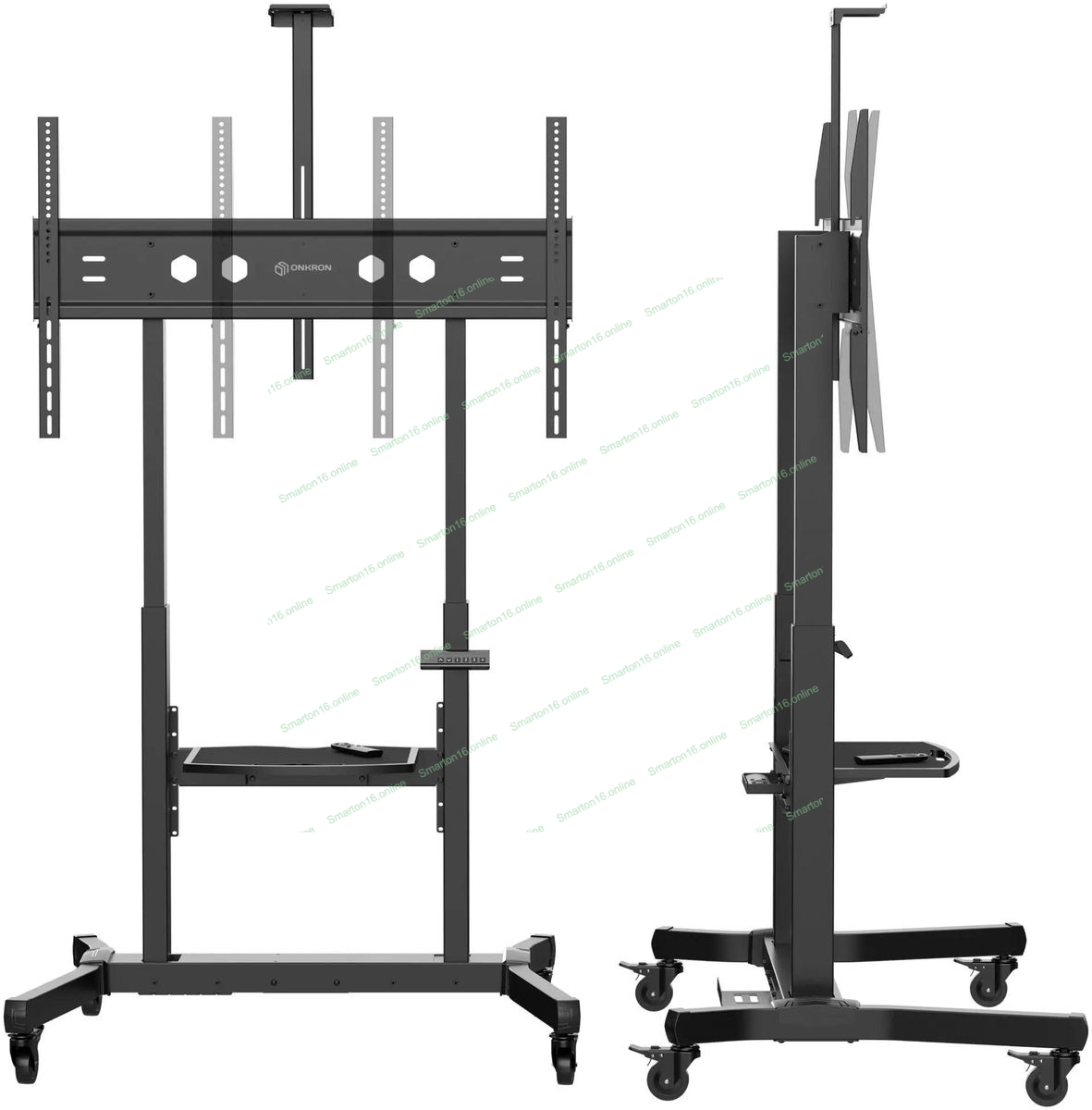 Мобильная стойка МОТОРИЗОВАННАЯ ONKRON на 1 ТВ/50-100" от 200х200 до 1000х600, макс нагр 130кг, 1 полка для AV, полка для камеры, кабель-канал, высота 1130-1600мм, черный