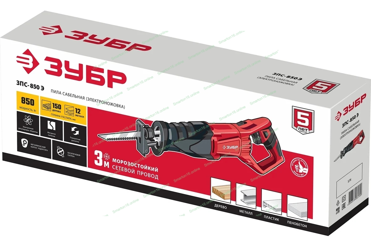 Пила сабельная Зубр [ЗПС-850 Э] 850 Вт, 0-2800 ход/мин, рез 150 мм (дерево), 12 мм (сталь), ход штока 28 мм
