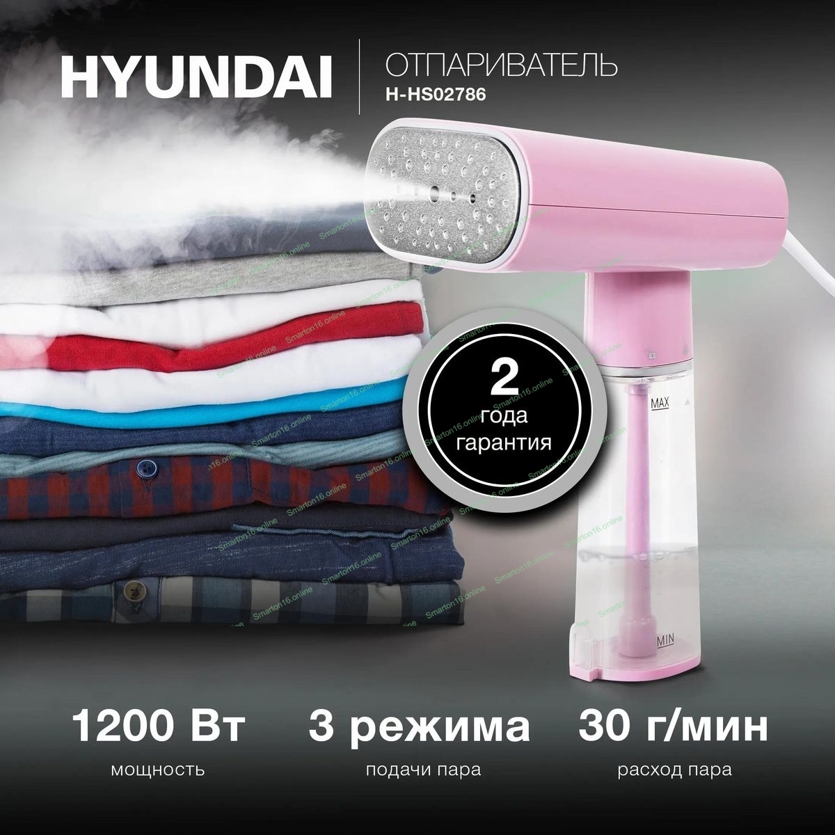 Отпариватель Hyundai H-HS02786 розовый, 1200 Вт, 21 г/мин, 150 мл