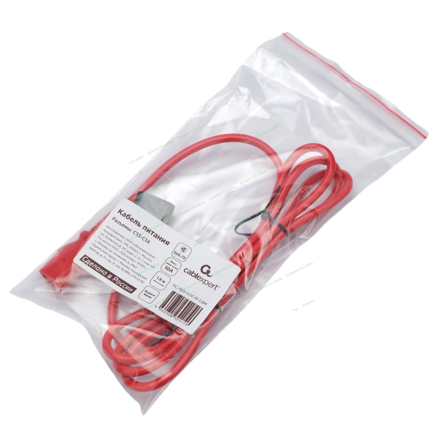Кабель питания Cablexpert PC-189-VDE-R-1.8M, C13-С14, 3x0.75мм2, 10A, с заземлением, медь, 1.8м, красный, пакет
