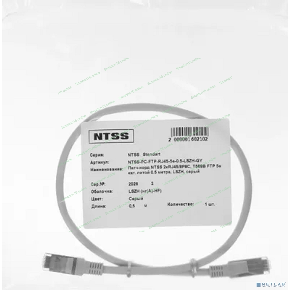 Патч-корд NTSS 2*RJ45/8P8C, T568B UTP 5e кат. литой 0.5 метра, LSZH, серый